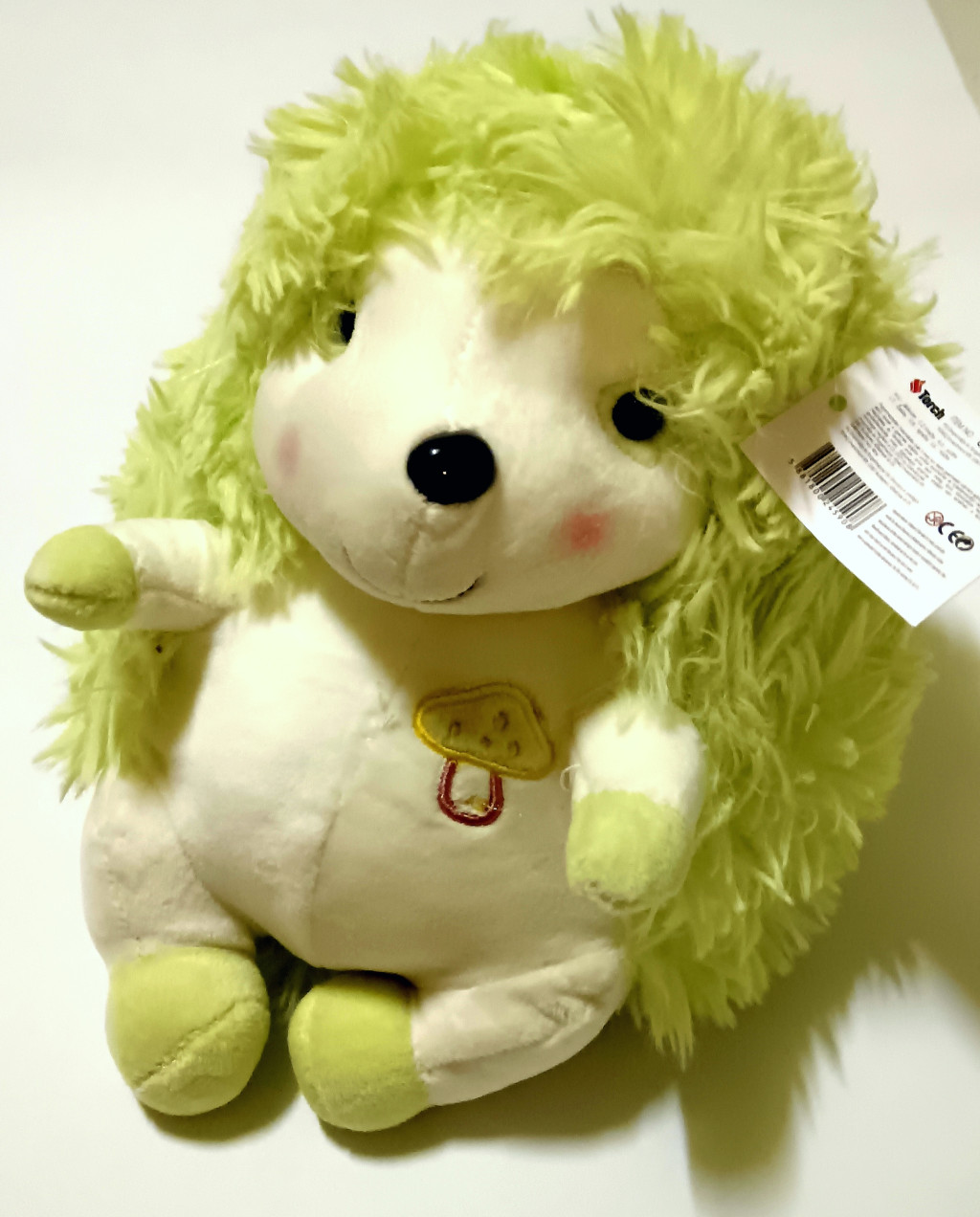 A képen látható játék zöld színű, puha tüskékkel és aranyos arckifejezéssel rendelkezik.