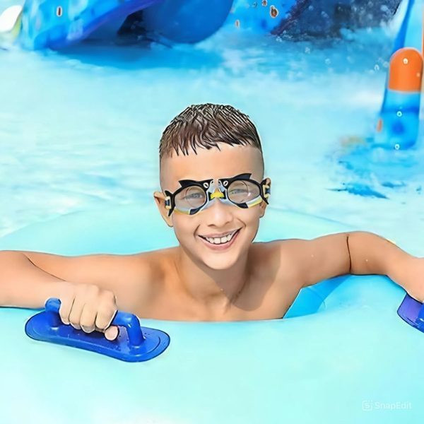 Állítható pánt – Az úszószemüveg rugalmas, állítható pánttal készült, így könnyen a gyermek fejméretéhez igazítható, biztosítva a stabil illeszkedést és kényelmes viseletet.