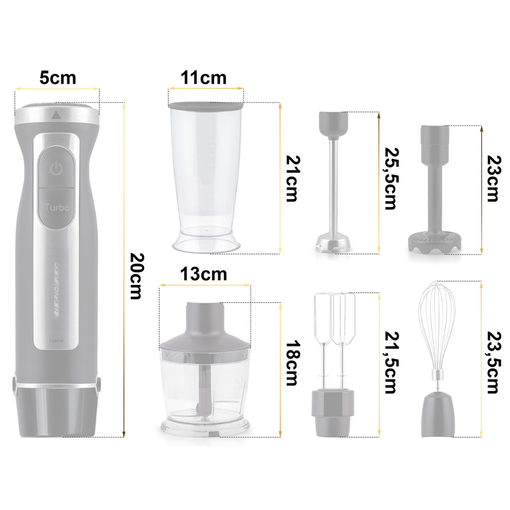 Szuper erős, 1500 W-os turmixgép, a tartozékok teljes készletével Berdsen 375400 Válasszon erőt, stílust és megbízhatóságot – válasszon a kulináris mesterek számára tervezett turmixgépet! A termék előnyei: Lenyűgöző erő a TURBO funkcióval – keveri a legkeményebb termékeket. Megbízható és lenyűgöző titán penge - pontosság és tartósság Multifunkcionális kiegészítők gazdag készlete – teljes körű támogatás a konyhában. Akár 6 különböző funkció! Kivételes minőség és stílusos dizájn – elegáns prémium megjelenés az acél részletekkel és matt felülettel. ⭐⭐⭐⭐⭐ Erős GOLD titán penge A titán GOLD pengét kivételes keménység és korrózióállóság jellemzi, ami a turmixgép sokkal hosszabb élettartamát jelenti. A titán nagy szilárdságának köszönhetően a penge könnyen megbirkózik a legkeményebb összetevőkkel is, ami gyors és hatékony keverést tesz lehetővé. A penge sima felülete megkönnyíti a tisztítást és a higiénia fenntartását, biztosítva a problémamentes mindennapi használatot. Alapvető keverési tipp Hozzávalók összekeverésére és sima masszává aprítására szolgál. Tökéletes krémlevesek, szószok, turmixok vagy zöldségpürék készítéséhez. Habverő/püré tartozék Puha összetevők, például burgonya, édesburgonya és egyéb zöldségek összetörésére és felverésére tervezték. Segít a püré egyenletes állagának elérésében. Aprítógép Kemény összetevők, például diófélék, hagyma, hús és fűszernövények aprítására és darálására tervezték. Lehetővé teszi a töltelék, paszták és apróra vágott hozzávalók gyors elkészítését. Keverőcsúcs egy csészével Hozzávalók összekeverésére és sima masszává aprítására szolgál. Tökéletes koktélok, turmixok, szószok és krémlevesek készítéséhez. Keverési tipp Tészta dagasztására, sütéshez szükséges alapanyagok keverésére és egyenletes állagú masszák készítésére tervezték. Habverő tartozék/habverő Használható tejszín, tojásfehérje, krémek és könnyű sütemények, például piskóták felverésére. Rendkívül erős motor - akár 1500 W-ig! Az erőteljes, 1500 W-os motor turbó funkcióval biztosítja a gyors és hatékony keverést, még a legkeményebb összetevők esetén is. A turbó funkció lehetővé teszi a teljesítmény azonnali növelését, megkönnyítve a nagy adag hozzávalók feldarabolását vagy összekeverését rövidebb idő alatt. 25 sebességfokozat és Turbo gomb. A turmixgép akár 25 sebességfokozatot is kínál zökkenőmentes beállítással és egy további TURBO üzemmóddal, amely biztosítja a maximális vezérlést és a keverési sebességet. Műszaki adatok Névleges teljesítmény: 1500 W Maximális fordulatszám: 17250 ford./perc Tápellátás: 220-240V Anyaga: acél és műanyag (BPA-mentes) Védelem a helytelen összeszerelés ellen Túlmelegedés elleni védelem Titán penge A tartály űrtartalma fedéllel: 800 ml 25 sebességfokozat Kábel hossza: 1,3 m Nettó tömeg: 1,55 kg Tanúsítványok: CE, REACH, ROHS