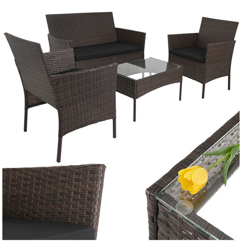 Brown technorattan garden furniture Gardlov - set of 2 chairs, sofa, table with glass and cushions