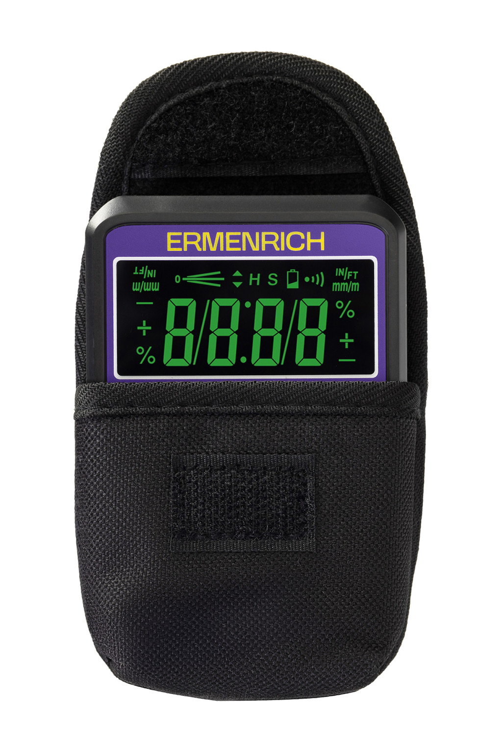 A leolvasott értékek a beépített monokróm kijelzőn jelennek meg, alatta pedig vezérlőgombok találhatók. Az Ermenrich Verk LQ40 digitális szintezővel néhány extra funkciónak köszönhetően könnyű a munka – lehetőség van a leolvasások „befagyasztására” és a készülék nullázására relatív szögek méréséhez. A mágneses V-horony talp segítségével a készüléket fémfelületen is rögzíteni tudja. A nagy szilárdságú ABS-műanyagból és polikarbonátból készült test ütésálló és véd a lehulló vízcseppekkel szemben. A készülék 2 hagyományos AAA elemmel működik, automatikus kikapcsolási funkcióval, amely 3 percnyi inaktivitás után kikapcsol.
