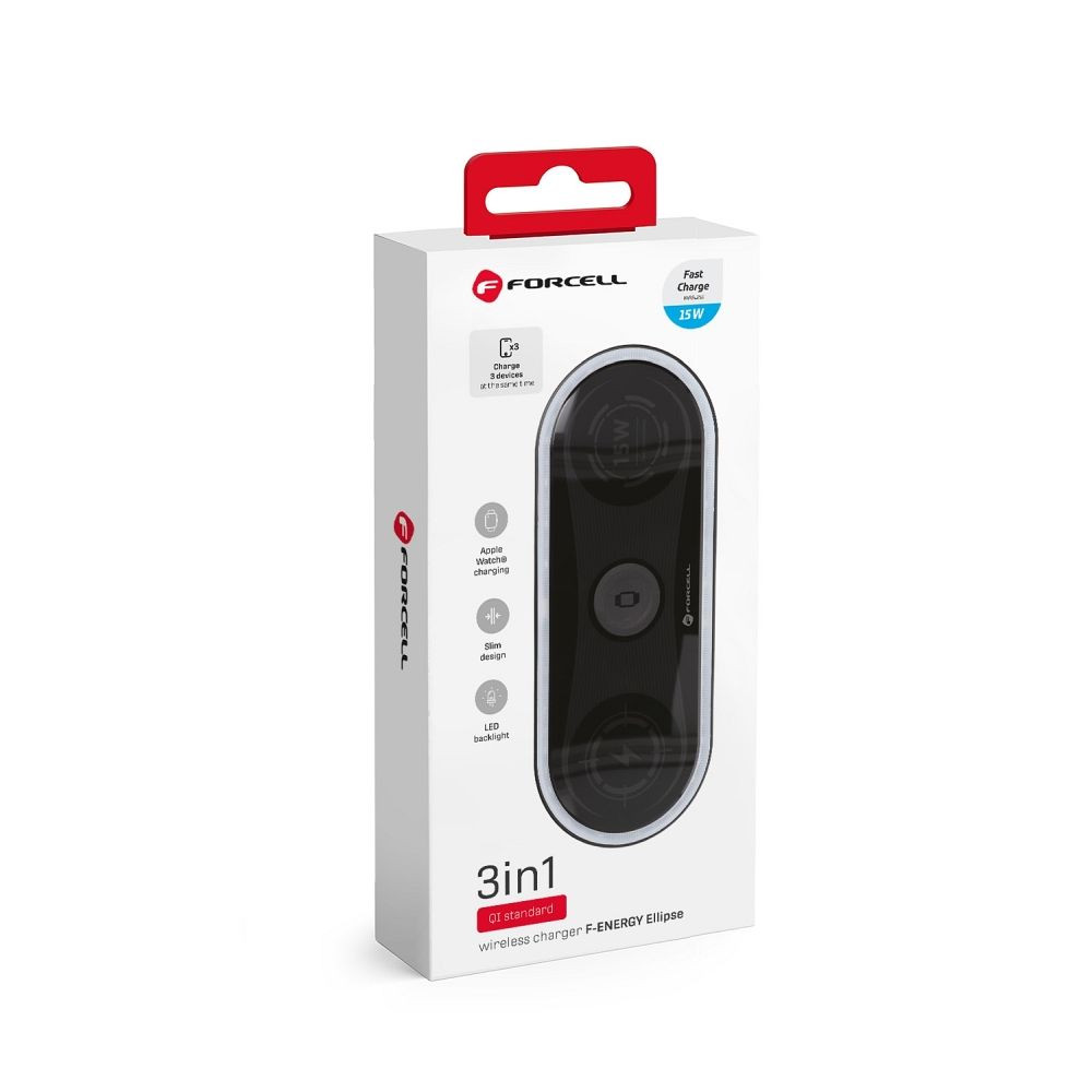 A Forcell F-ENERGY Ellipse 3 az 1-ben vezeték nélküli töltő egy megbízható és sokoldalú eszköz, amellyel egyszerre töltheti okostelefonját, óráját és TWS fülhallgatóit, több kábel nélkül. Támogatja az összes Qi szabványnak megfelelő mobileszközt. Kompatibilis az olyan Apple termékekkel, mint az iPhone, az Apple Watch és az AirPods. Három eszköz egyidejű töltésének képességével, vékony kialakításával, megvilágításával és hordozhatóságával ez a termék kényelmet, hatékonyságot és stílust biztosít.