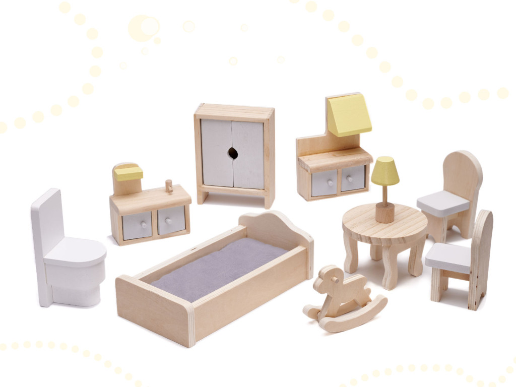 - Bútorzat (2x szék, kerek asztal; lámpa; hintaló; szekrény nyitható ajtóval; szekrény motorháztetővel, szekrény mosogatóval; WC)