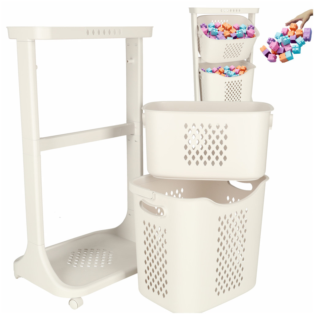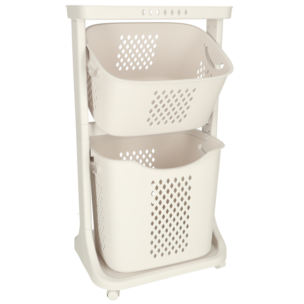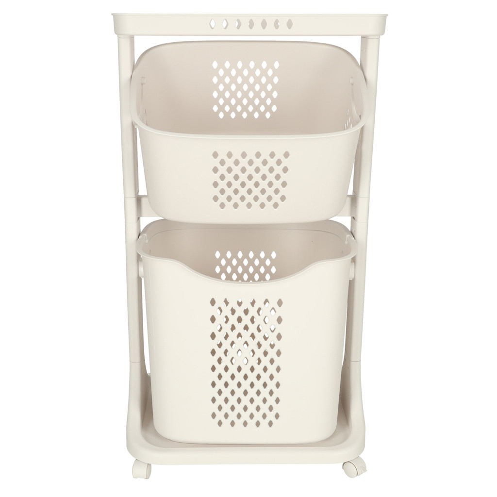 Kerekeken guruló, kétszintes szervező, amely segít a különböző tárgyak rendszerezésében. A legnagyobb kosár fogantyúval rendelkezik a könnyű hordozás érdekében. Anyaga: műanyag. Méretek: 44 cm x 77,5 cm x 32 cm.