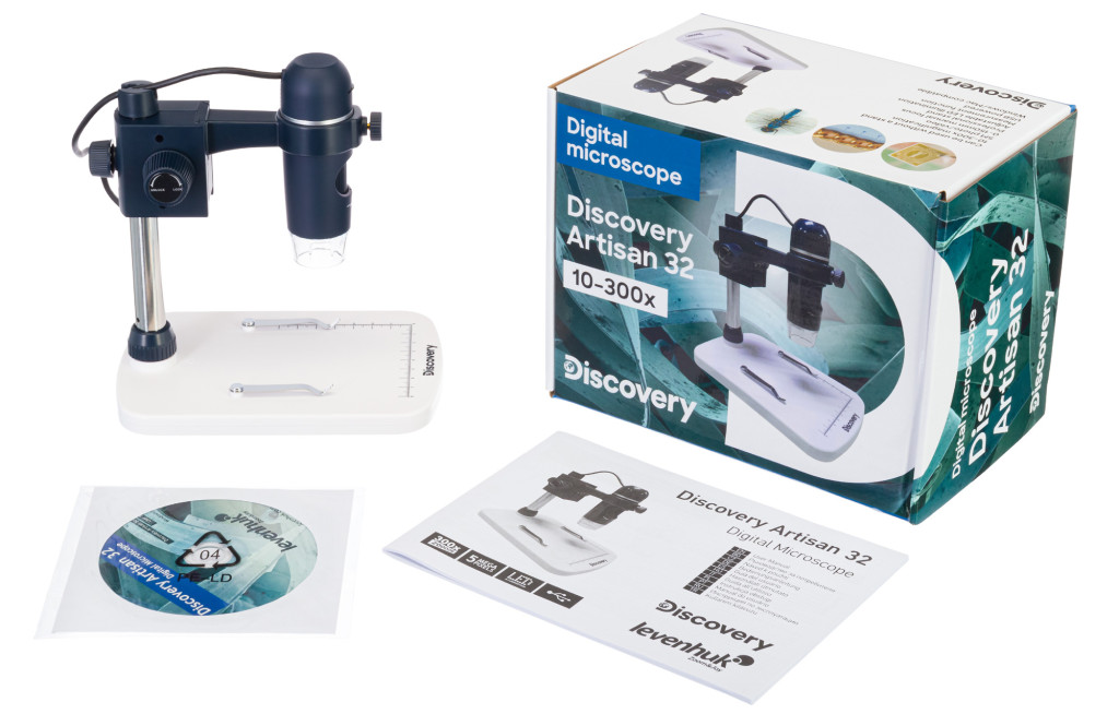 A Levenhuk Discovery Artisan 32 egy speciális állvánnyal rendelkező digitális mikroszkóp. Ez az eszköz tökéletes választás precíziós munkákhoz, például numizmatikai célokra, ékszerészeti munkákhoz, órajavításhoz és otthoni használatra. A mikroszkóppal vizsgált objektum képének egy külső képernyőn történő megtekintéséhez csatlakoztatnia kell a mikroszkópot a számítógéphez egy USB-kábelen keresztül, és fel kell telepítenie a szoftvert (a kábel és a szoftver is benne van a csomagban). A mikroszkóp lehetővé teszi képek és videók készítését és szerkesztését, valamint lineáris méretek, átmérők, sugarak és más méretek mérését.