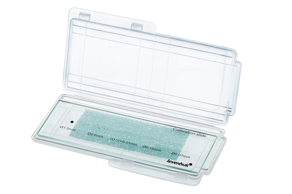 A Levenhuk MED X/Y kalibrációs tárgylemez átlátszó üvegdarab. Középpontjában mikrométeres skála található. A legkisebb osztás 0,01 mm. A skála két oldalán különböző átmérőjű (1,5 mm, 0,6 mm, 0,15 mm és 0,07 mm) körök vannak.