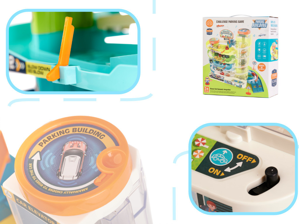 A parkoló akár 4 szintes, a készletben található autók parkolására tervezték. Az autók egy automata felvonó segítségével jutnak fel a tetejére.
