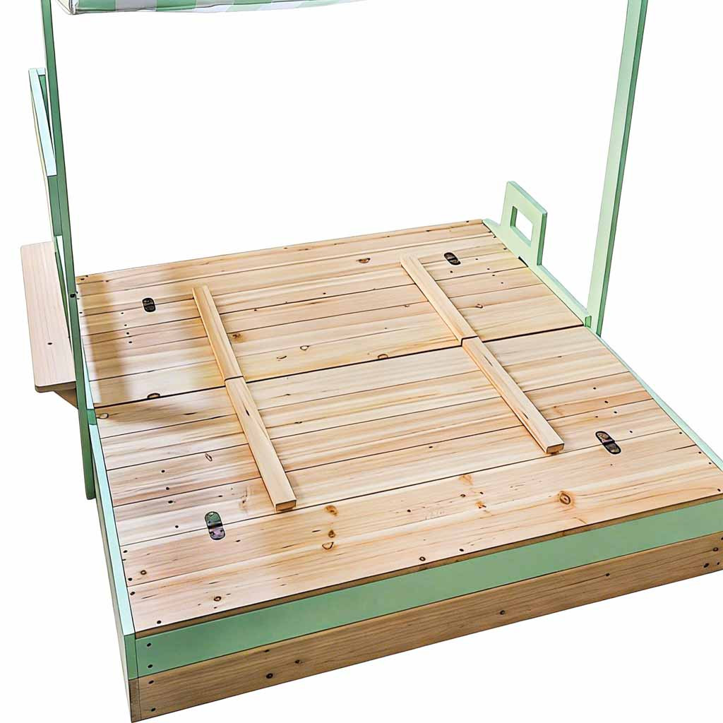 Przed użyciem zapoznaj się z instrukcją obsługi. Montaż piaskownicy powinna wykonać wyłącznie osoba dorosła. Produkt nieodpowiedni dla dzieci poniżej 3 roku życia – zawiera małe elementy i ruchome części (obrotowy dach, zamykane siedziska). Do użytku pod bezpośrednim nadzorem osoby dorosłej. Nie używaj w czasie silnego wiatru i burzy. Regularnie sprawdzaj stabilność daszku, elementów mocujących i stan drewna. Produkt łatwopalny. Trzymaj z dala od ognia.