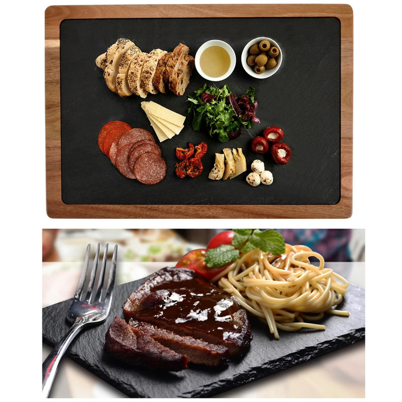 Akáciafa és pala tálaló deszka, amely használható steaktálként, gyümölcstálként, előétel kínálótálként, desszerttálként, sajttálként vagy salátatálként stb.