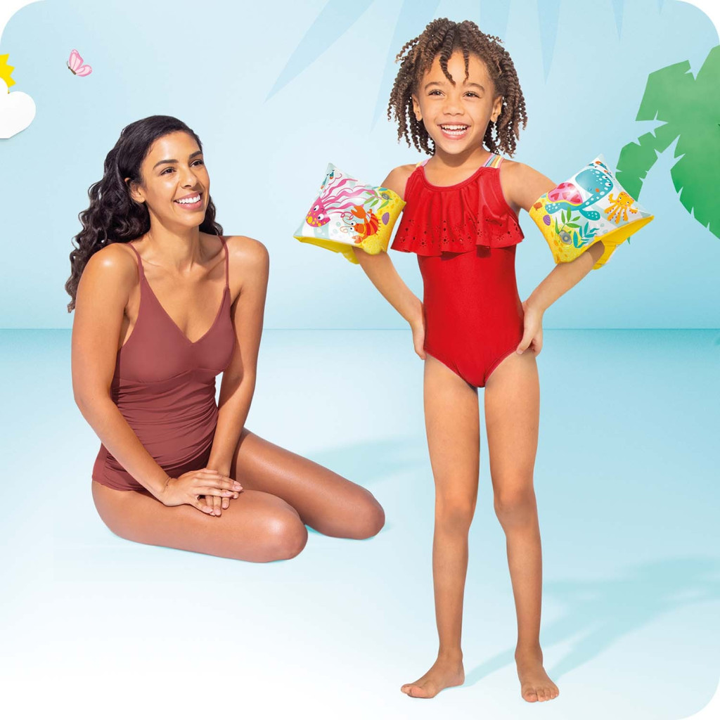 Főbb jellemzők: 2 db egy készletben; kétkamrás szerkezet; kopásálló anyag; szoros szelep; úszni tanulni; könnyű felvenni; csúszásgátló felület vízben; 3-6 éves gyermekek számára; legfeljebb 30 kilogramm súlyú gyermekek számára készült; alkalmas: medence, tó, tenger. Műszaki adatok: Méretek: 23 x 15 cm Anyag: PVC PVC vastagság: 0,20 mm Súly: 0,12 kg Javasolt életkor: 3-6 év Terhelhetőség: 18-30 kg Rekeszek száma: 2
