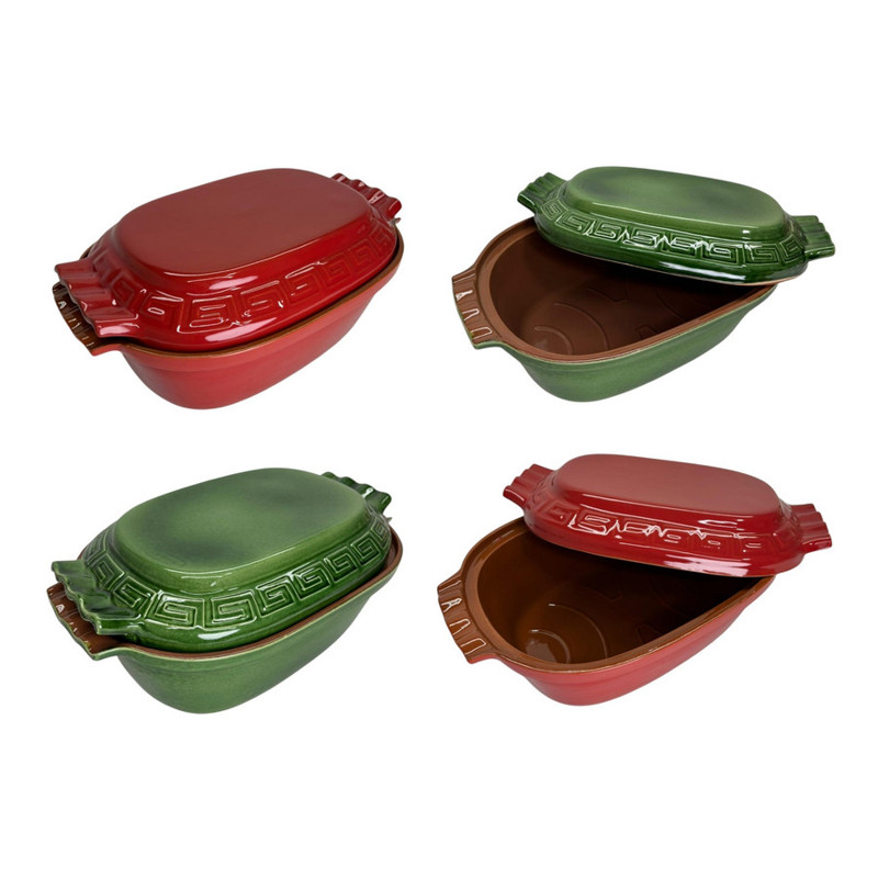 Használata: az edényt első alkalommal 30 percig, további sütések alkalmával 15-60 percig hideg vízben áztassa. Az edényt mindig hideg sütőbe, rácsra tegye, és fokozatosan melegítse a kívánt sütési hőmérsékletre. A forró edényt ne hűtse hirtelen, fa deszkára, hőálló alátétre vagy száraz ruhára helyezze!