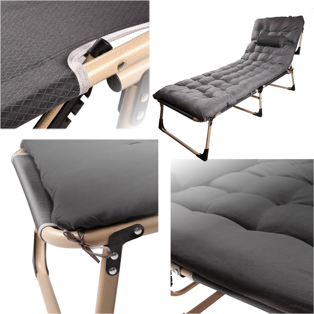 Többfunkciós összecsukható terepágy párnával és matraccal. Otthon, sátorban és kempingezéskor is használható - a 4 fokozatú háttámla állítási rendszer lehetővé teszi, hogy fekvőhelyként is használható legyen. Az ágy méretei: 193 cm x 66 cm x 23 cm, színe: sötétszürke.