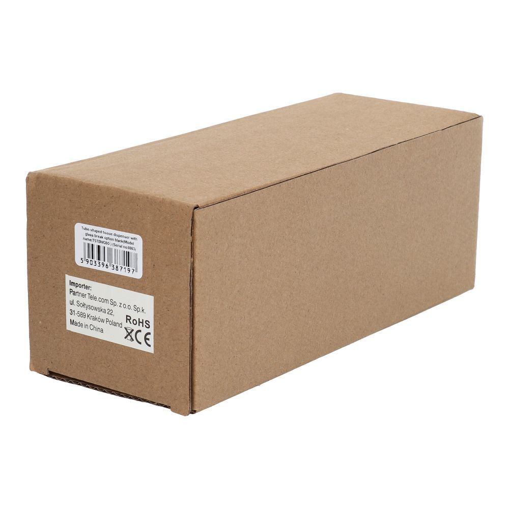 A cső alakú papírzsebkendő-adagoló üvegtörés lehetőségével elegáns és funkcionális kiegészítője minden belső térnek. A kiváló minőségű ABS és PU műanyagból készült tartály tartósságot és esztétikus megjelenést biztosít. Modern kialakítása ideálissá teszi bármilyen helyiségbe, az üveg könnyű betörésének lehetősége pedig lehetővé teszi a zsebkendők gyors és kényelmes eltávolítását.