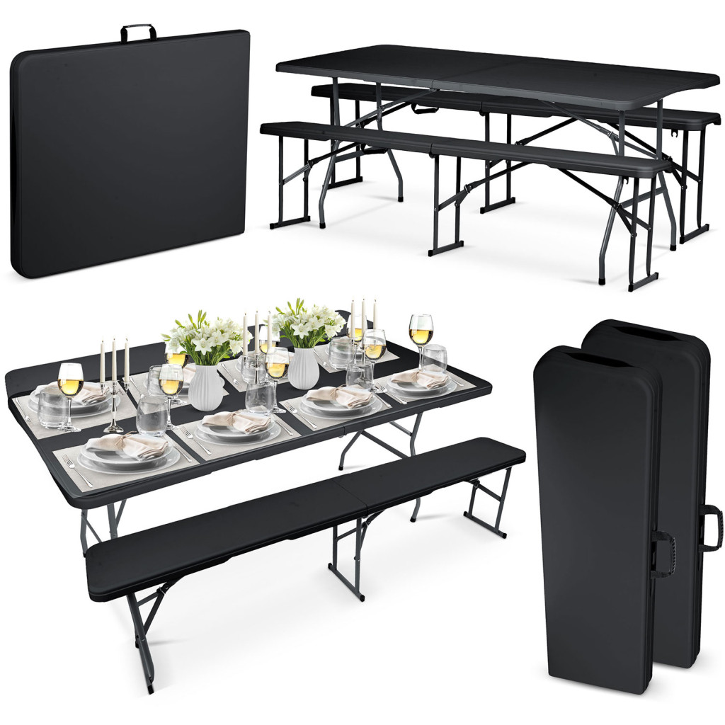 Kerti vendéglátó szett összecsukható asztal + 2 pad 180 cm Plonos fekete